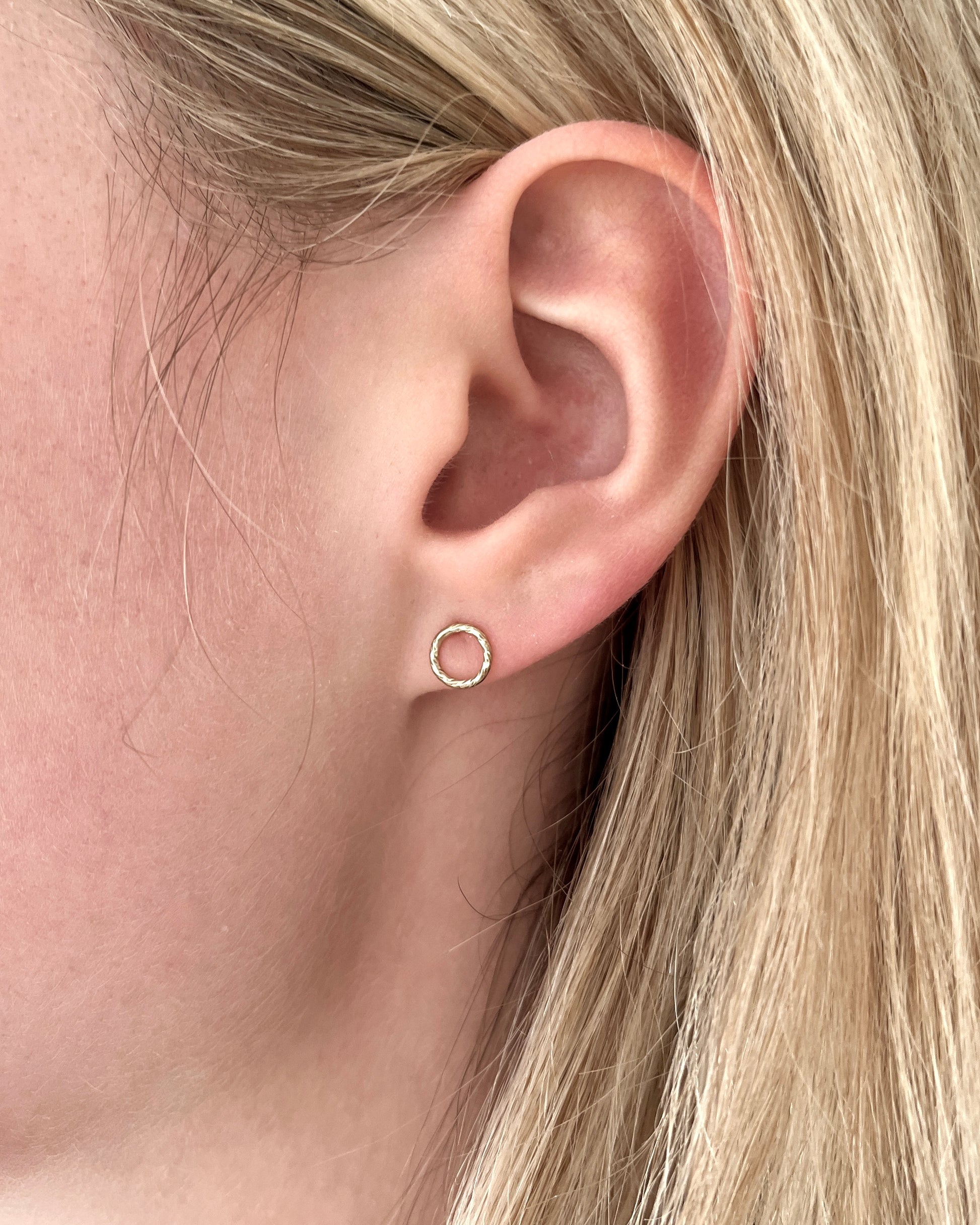 Delicate with some pretty sparkle, these gold geometric studs are a great option for everyday wear. The petite circles are 7mm wide and they're made with diamond-cut gold-filled wire that gives the studs some great texture. The earrings are very lightweight and comfortable to wear and a perfect choice for a gold accessory to wear again and again. The minimalist studs also feature gold-filled posts and the earrings are held securely in place with gold-filled backings.