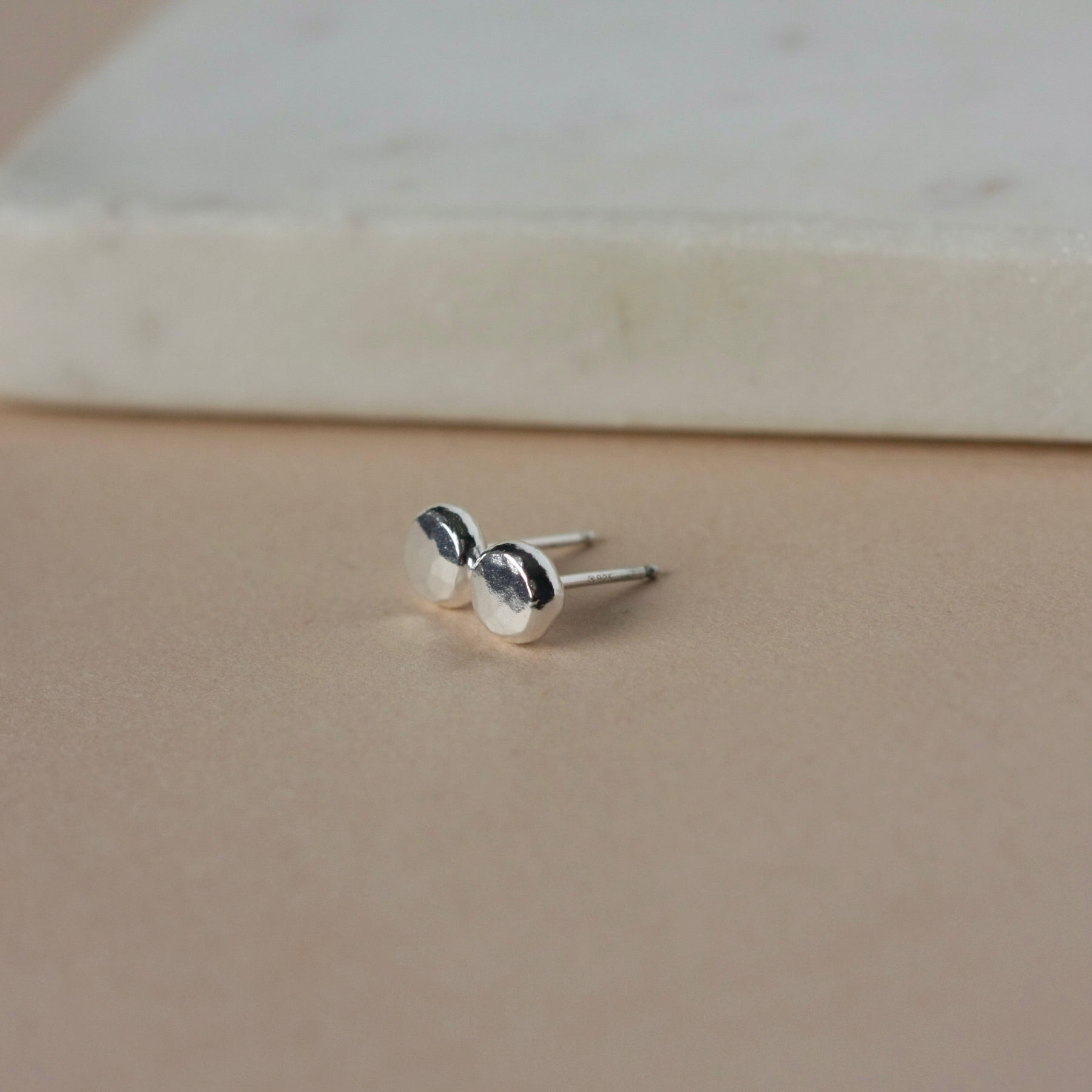 Perfect earrings to add to an everyday jewelry collection! These sleek pebble studs are made with fine silver (99.9% pure) with a beautiful bright polish. I melted the silver into round discs and then hammered them for some subtle faceting. Due to this process the pebbles aren't perfectly symmetrical but have a bit of an irregular shape to them. The pebbles are about 6mm wide with a nice shine and weight to them. I've soldered sterling silver posts to the middle backs of them and they're held securely in place with sterling silver backings. So easy to wear and style, I'm sure they'll become a favorite for daily wear.