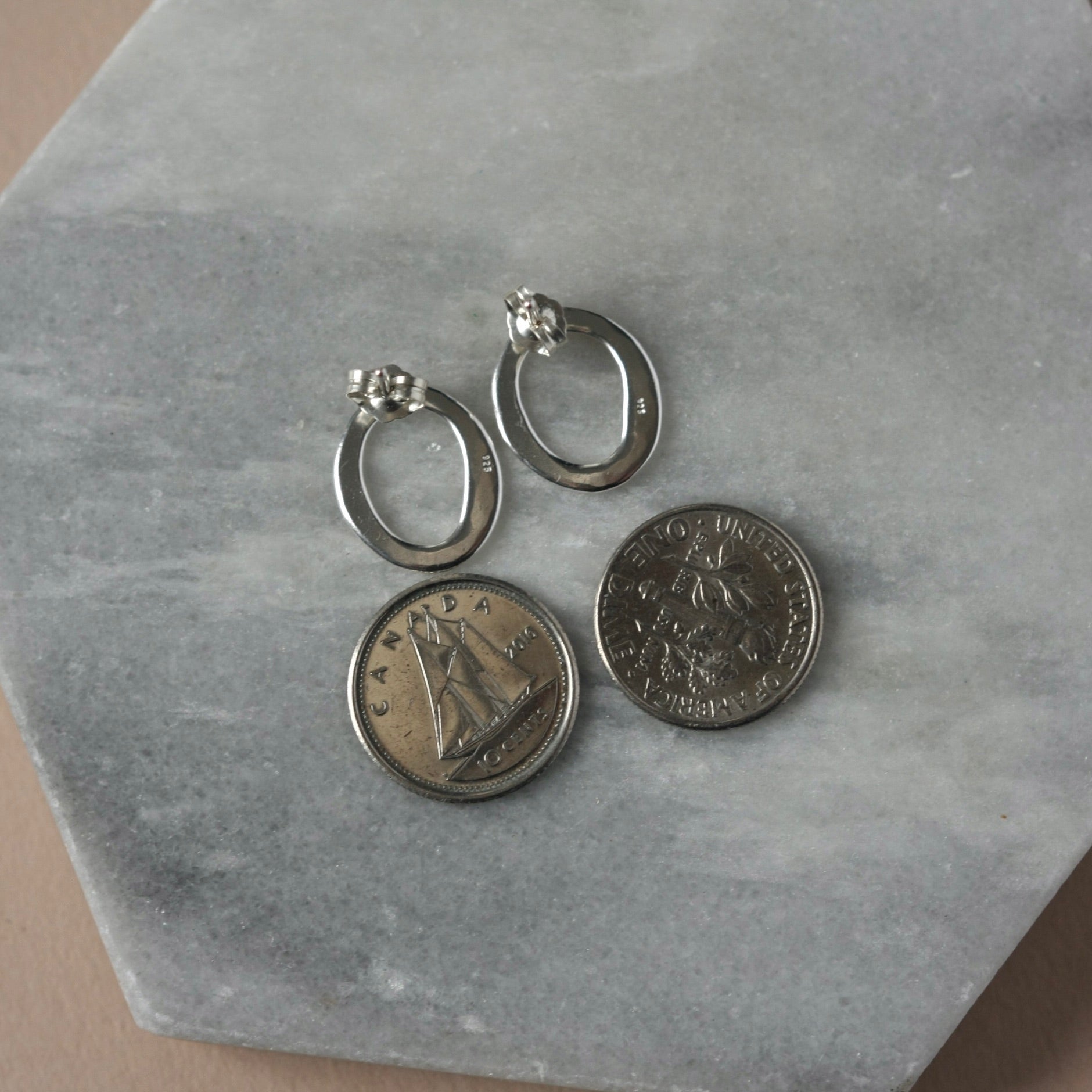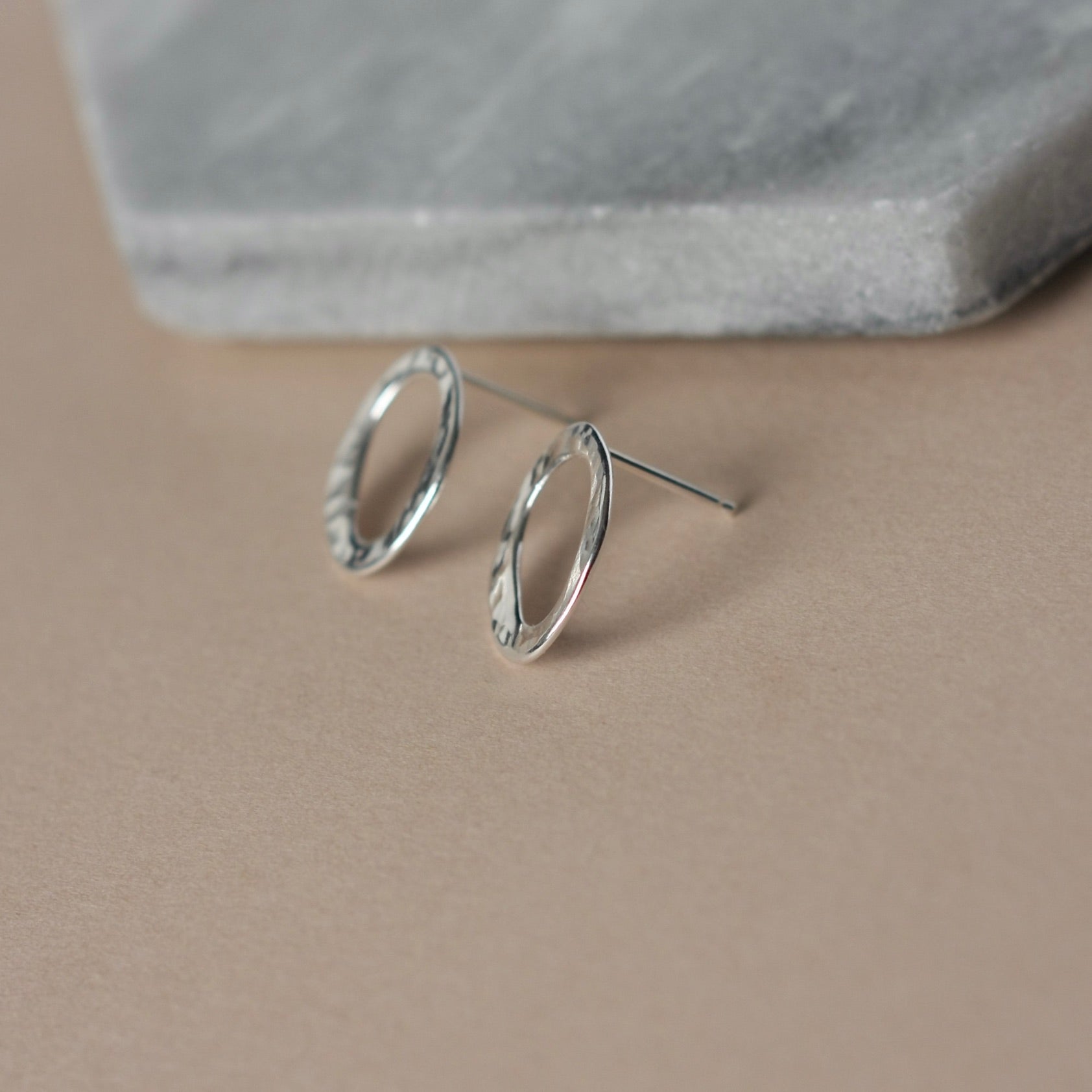 These modern geometric studs have a unique shape and a beautiful shine to them. The circles have a freeform organic look and they've been hammered for texture and for extra shimmer. The circles measure 13mm at their widest and about 15mm long and they're made of thin wire so the studs are very lightweight. I've soldered sterling silver posts to the tops of them and they're held securely in place with sterling silver backings. These sleek minimalist earrings have a fun contemporary vibe to them and I think they'd look fabulous with both casual and dressy outfits.