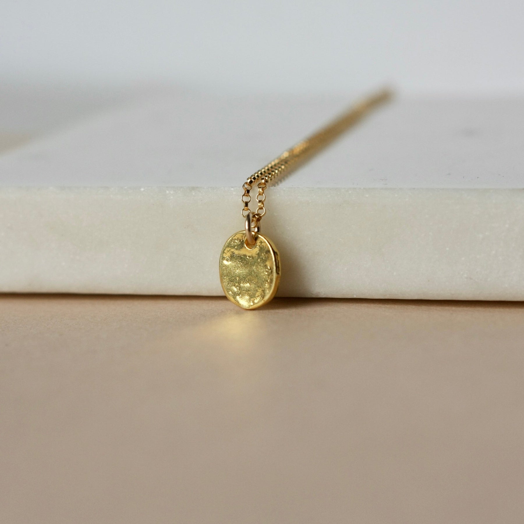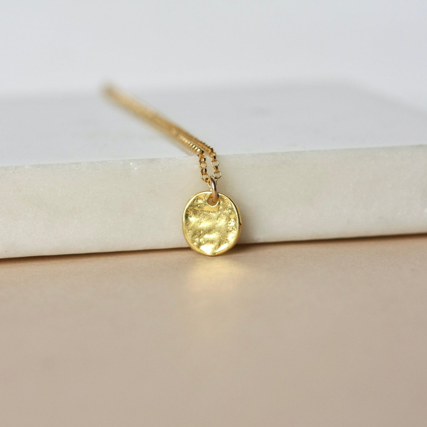 Sleek and stylish, this gold necklace is a chic jewelry staple that you'll want to wear on repeat. It has an elegant, minimalist design and features a shiny gold vermeil disc sliding along gold-filled rolo chain. The 10mm disc is slightly asymmetrical with an irregular texture and it has a gorgeous warm golden tone. The necklace is perfect for everyday wear and would be a beautiful accent to any outfit. The geometric design is always in style and the necklace looks lovely on its own but also makes the ideal layering piece to pair with others. The necklace is fastened with a gold-filled spring ring clasp and you can choose your desired length from the options above.