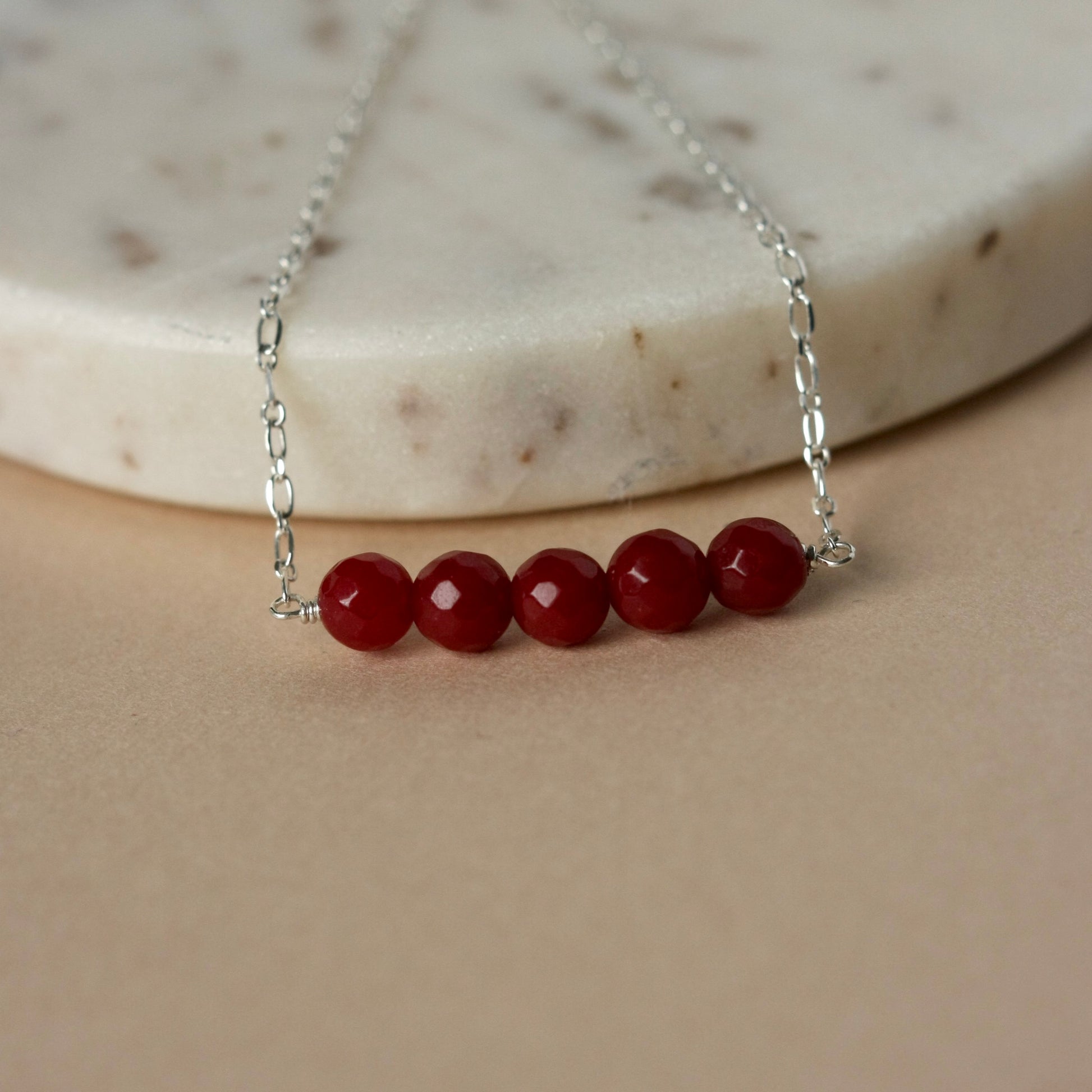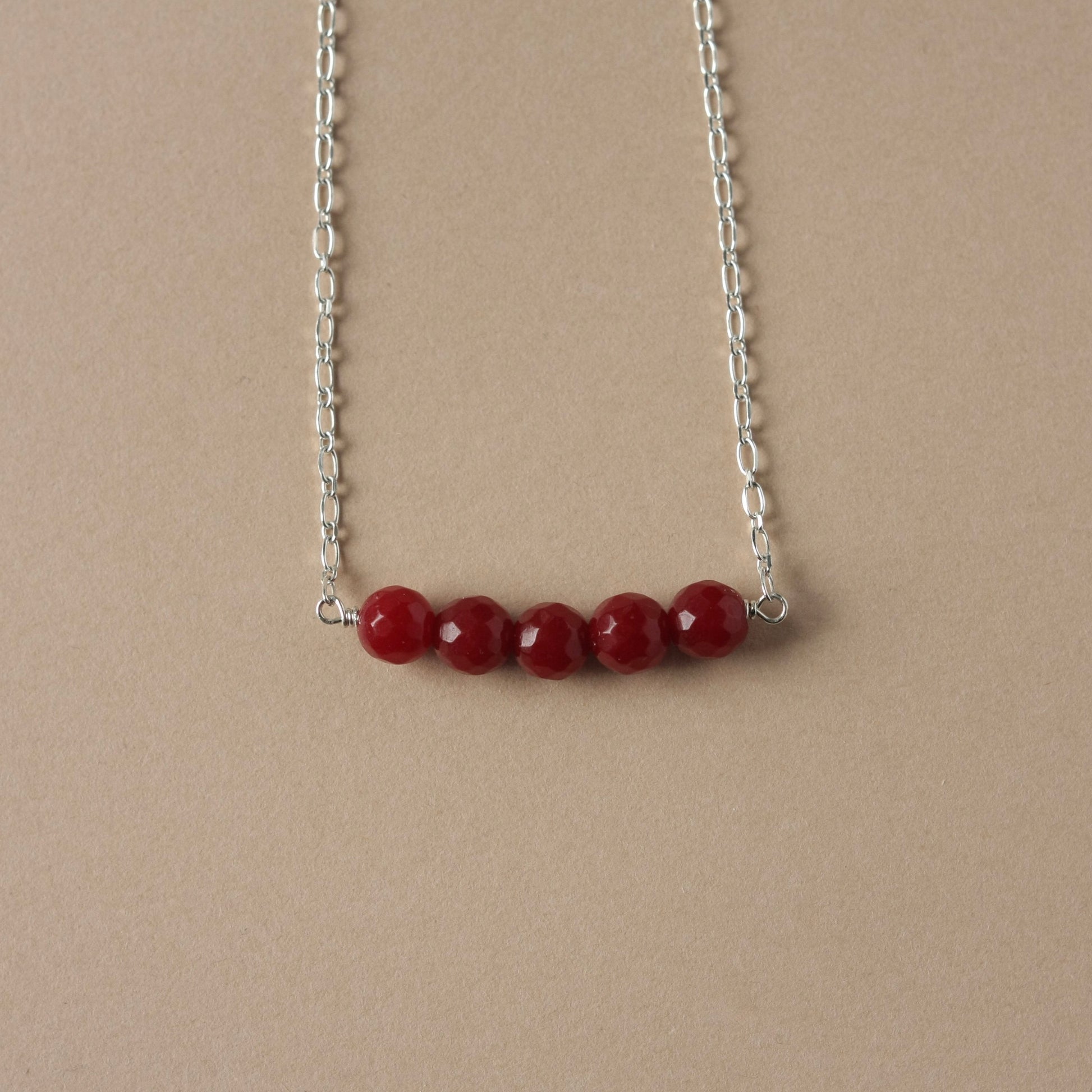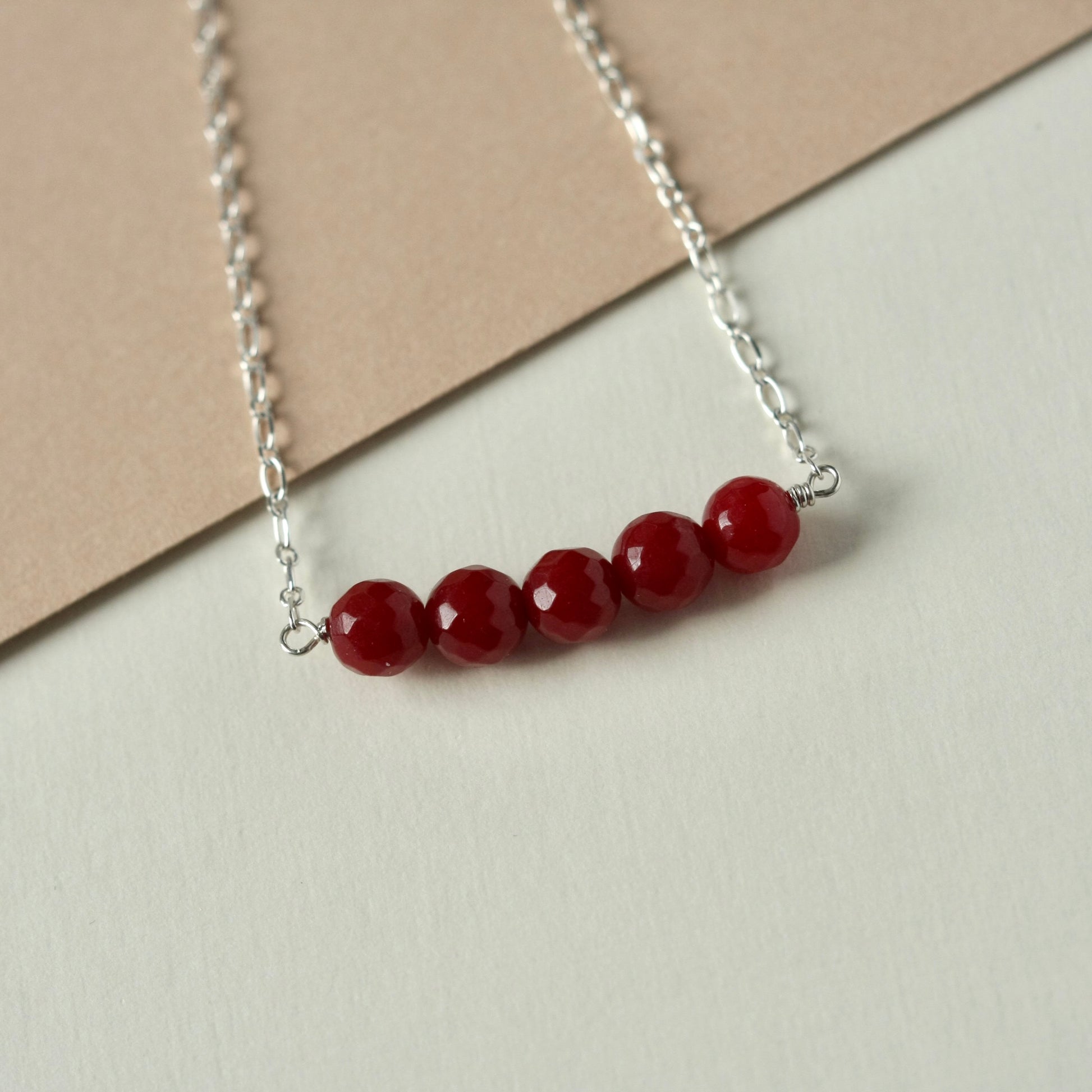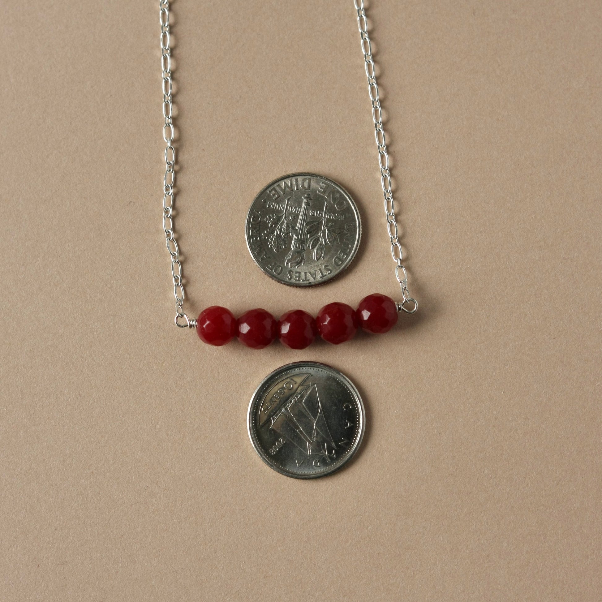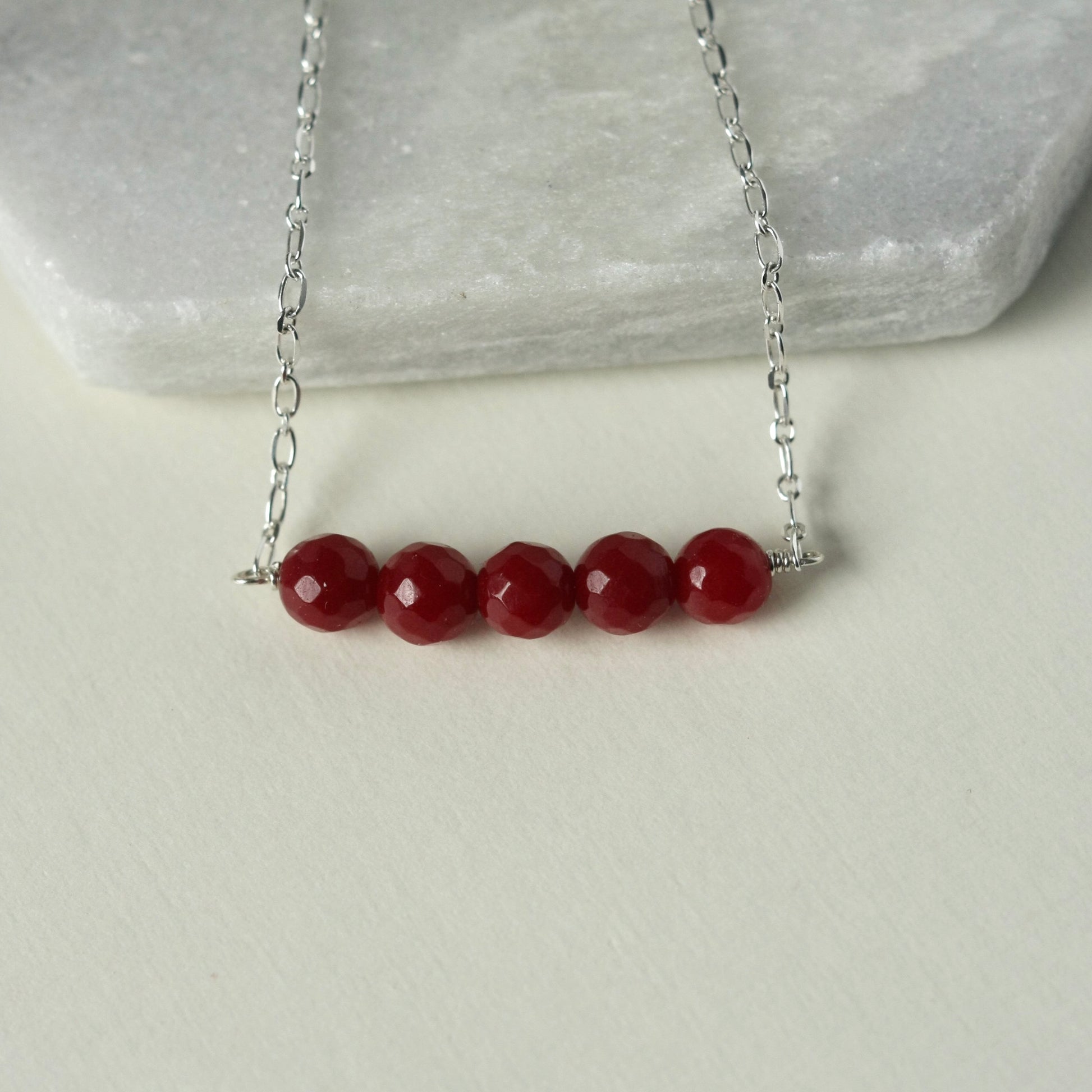 Add some fun color to your wardrobe with this minimalist gemstone necklace that features round jade beads in a dark ruby red. The beads are 5mm in diameter and are faceted for some pretty sparkle. I've wire wrapped the stones in sterling silver wire on to sterling silver chain for a simple, elegant design that looks great with both casual and dressy outfits. The row of jade beads is about 1.25 inches wide and the rich tones will definitely get them noticed. The necklace is fastened with a sterling silver spring ring clasp and you can choose your desired length from the options above.