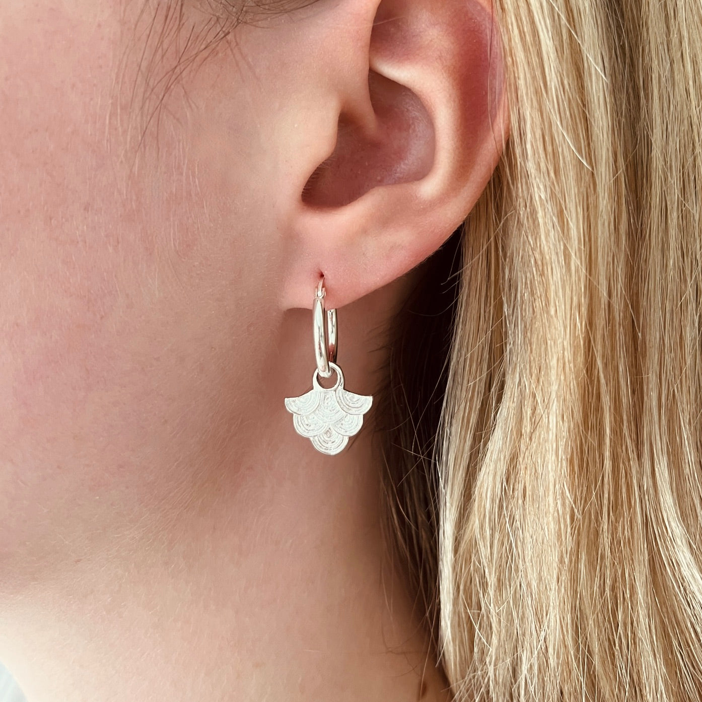 These hoops are so fun and boast a unique design and a beautiful contrast of textures. The small hoops are 15mm wide and are made of sterling silver with a bright, shiny polish. Dangling beneath the hoops are wonderfully detailed art deco charms with an intricate pattern. You can conveniently remove the charms from the hoops, giving you two looks in one. The hollow hoops are lightweight and comfortable to wear and have a secure hinged closure. The total length of the earrings from the top of the hoops to the bottom of the charms is about an inch. These versatile hoops are sure to become favorites!