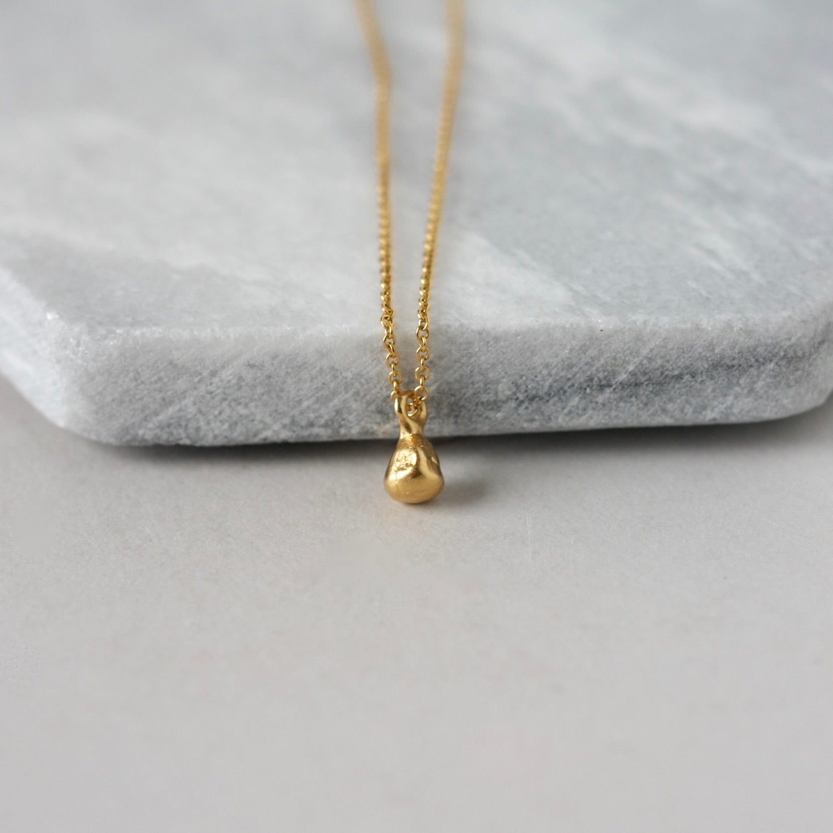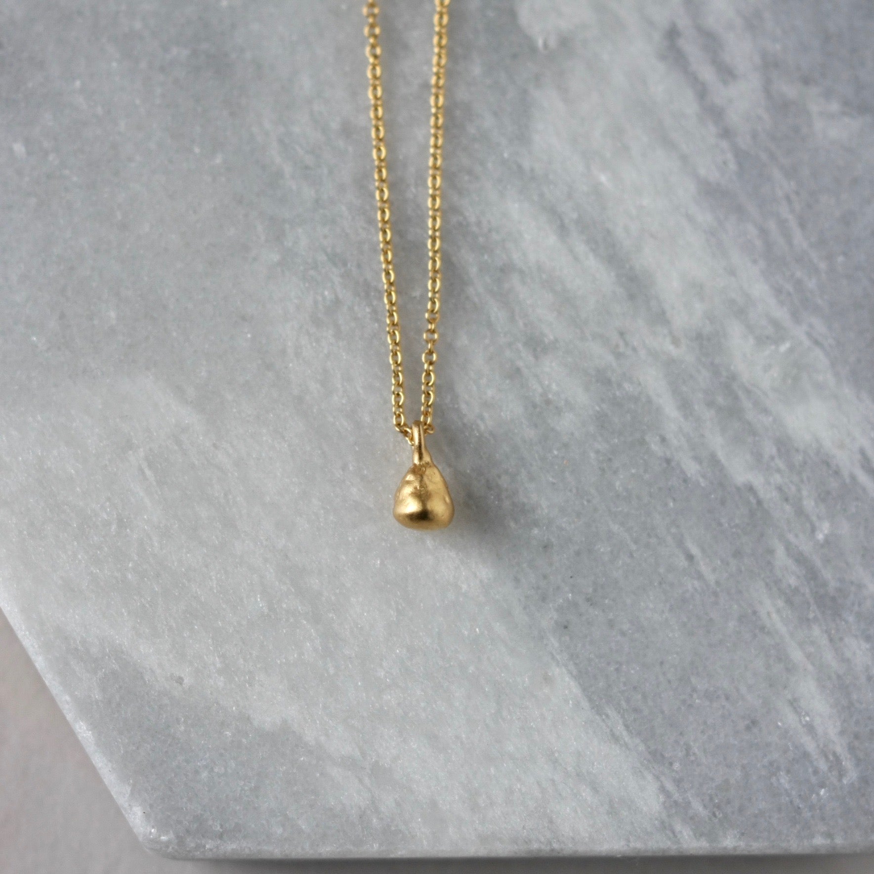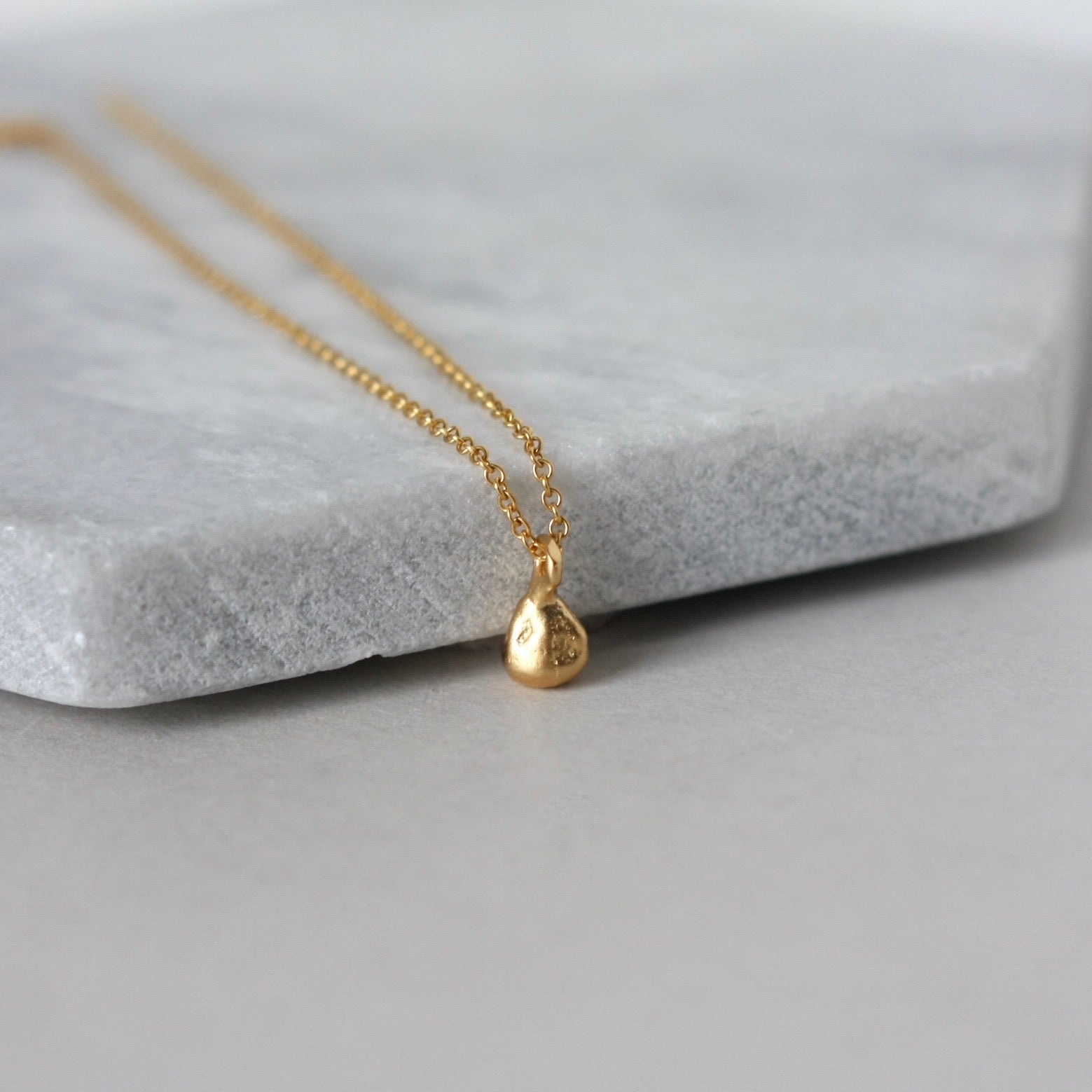A dainty minimalist necklace ideal for any occasion! This necklace features a 18k gold vermeil teardrop nugget that has a beautiful warm matte shine. The solid teardrop has an organic look to it and is very petite at just 7mm long (including the loop). The charm is paired with gold-filled cable chain and the necklace looks chic worn alone or as a perfect layering piece when worn with others. The necklace is fastened with a gold-filled spring ring clasp and you can choose your desired length from the options above.