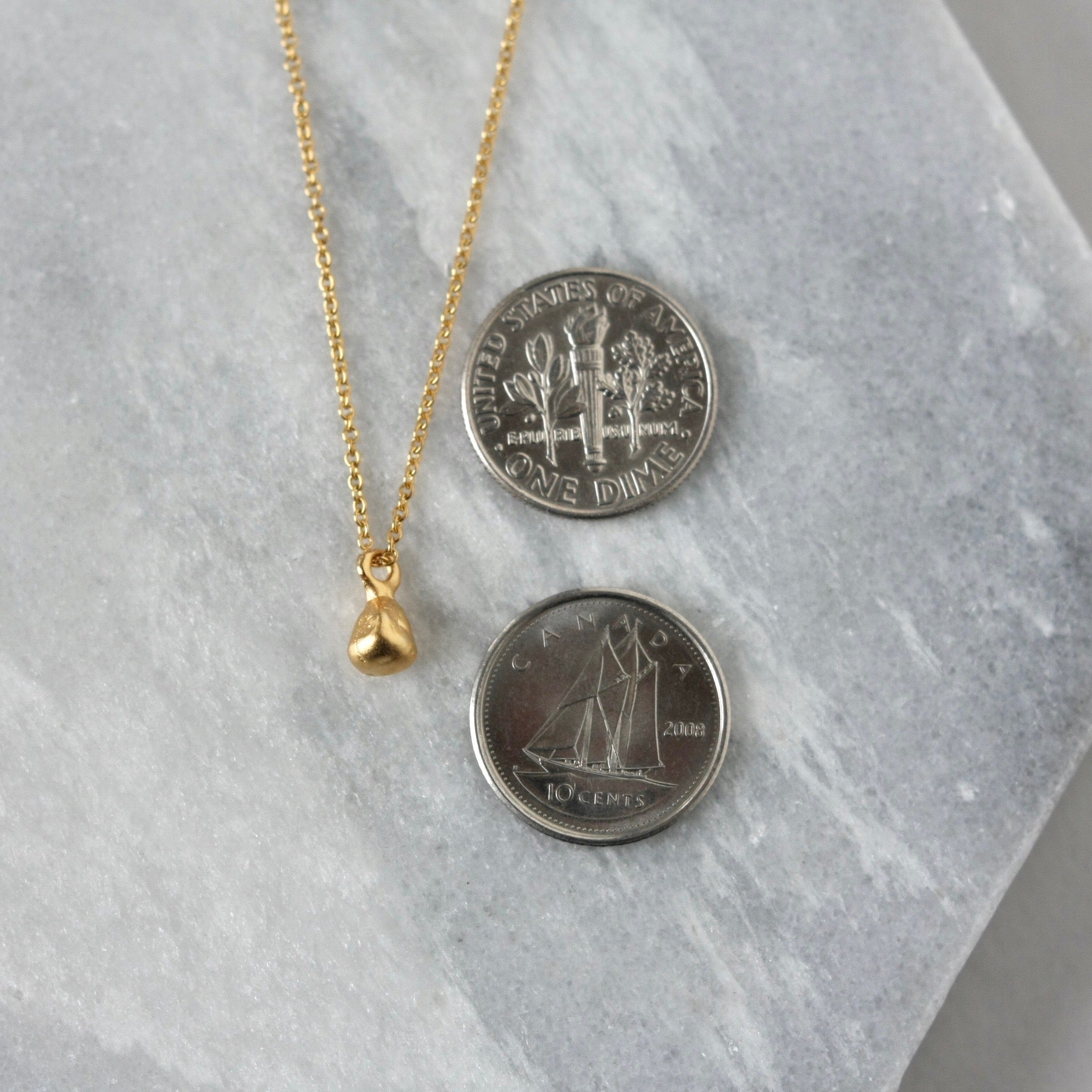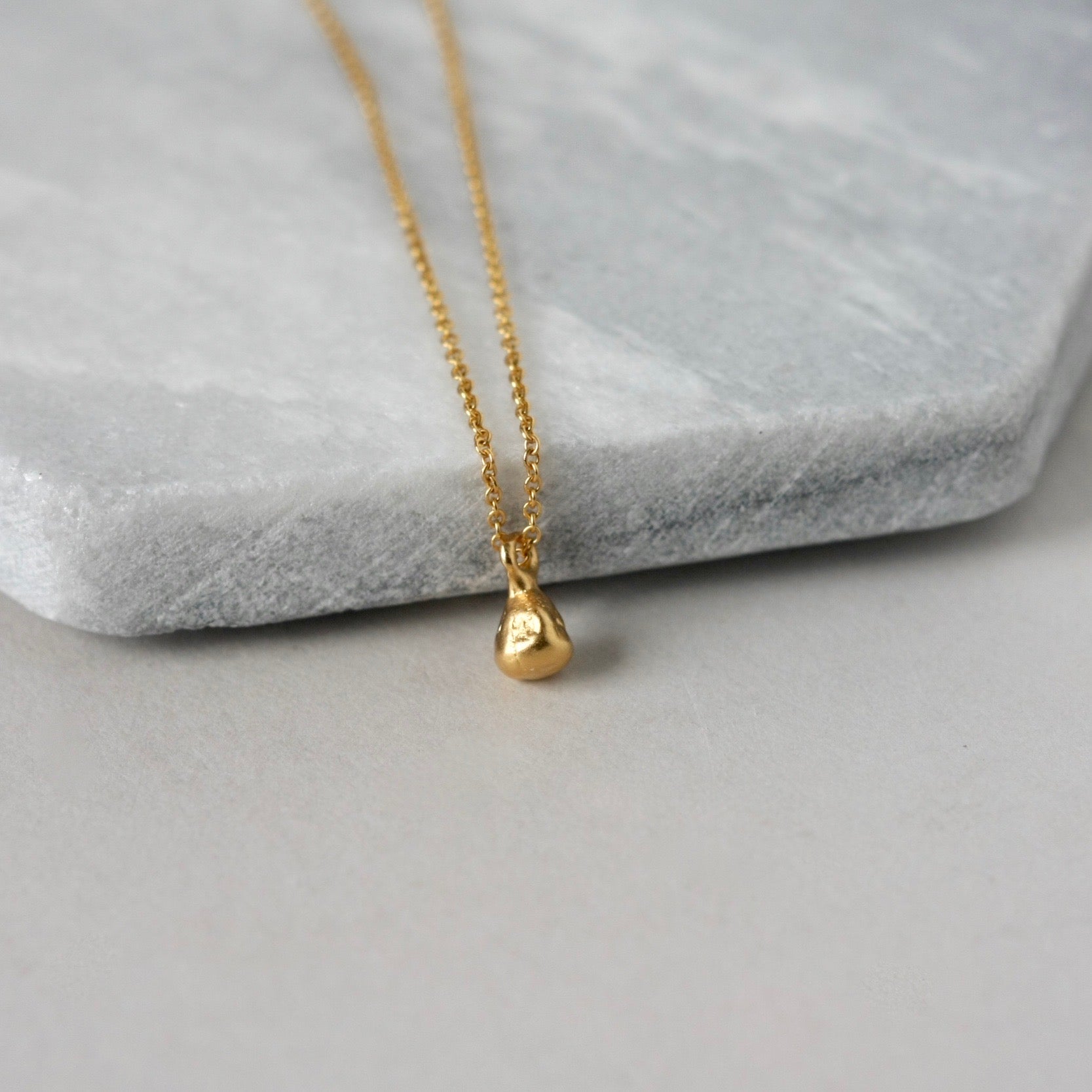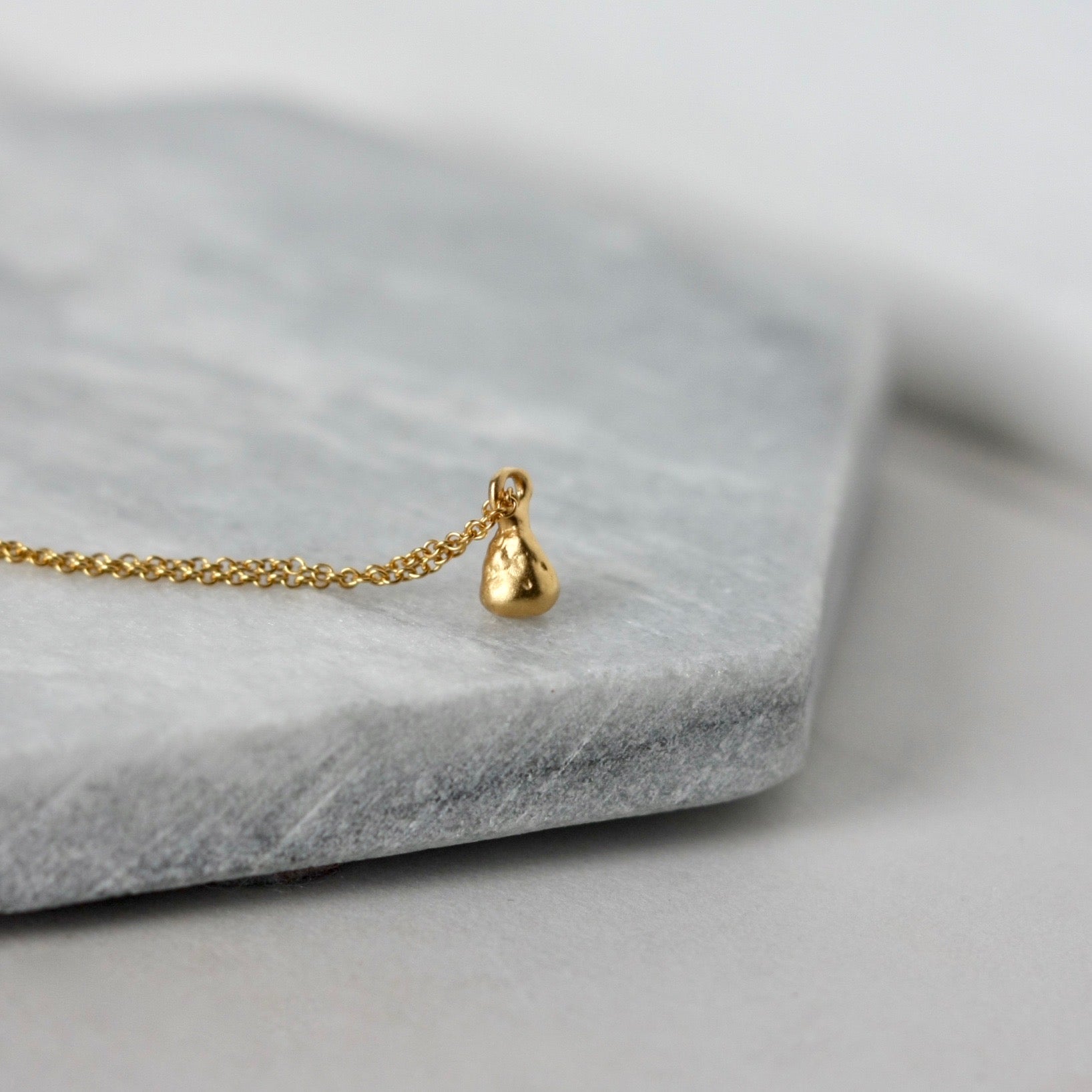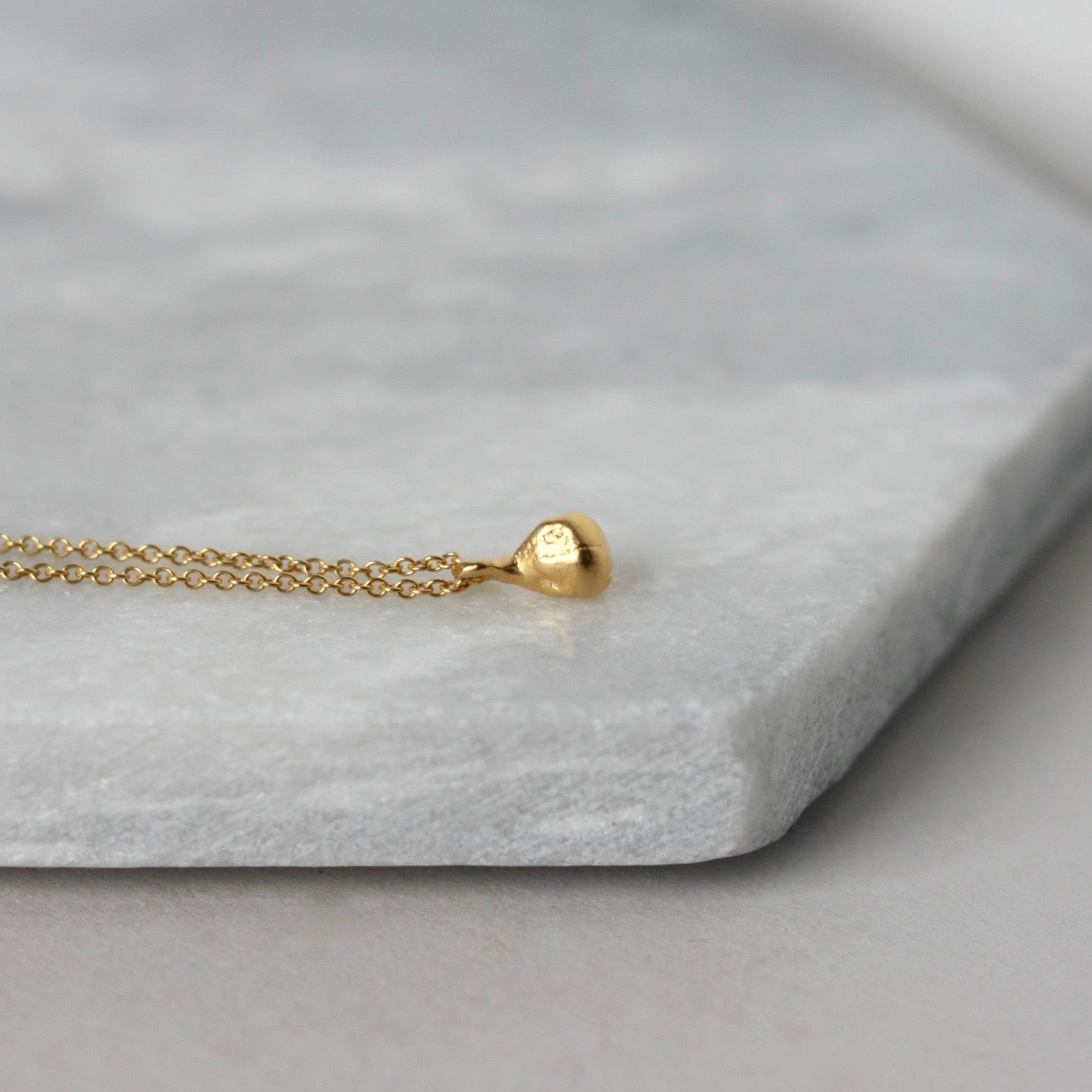 A dainty minimalist necklace ideal for any occasion! This necklace features a 18k gold vermeil teardrop nugget that has a beautiful warm matte shine. The solid teardrop has an organic look to it and is very petite at just 7mm long (including the loop). The charm is paired with gold-filled cable chain and the necklace looks chic worn alone or as a perfect layering piece when worn with others. The necklace is fastened with a gold-filled spring ring clasp and you can choose your desired length from the options above.